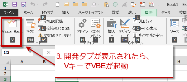 開発タブが表示されたら、VキーでVBEが起動になります。
