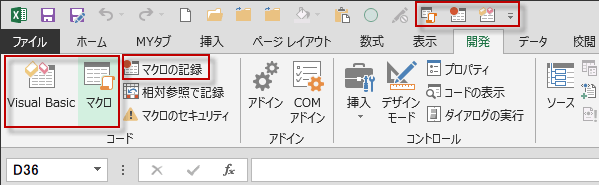 開発タブが表示してない時は、クイックアクセスツールバーに登録したボタンから起動できます。