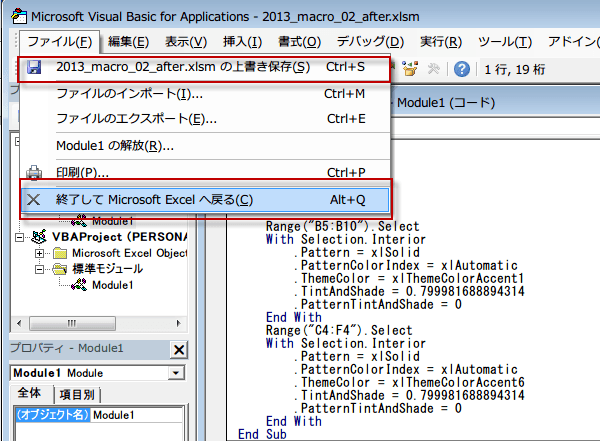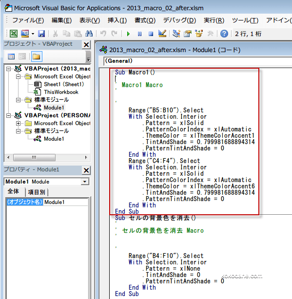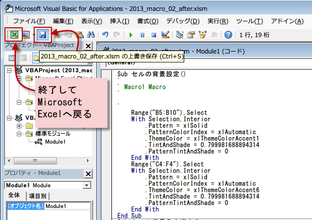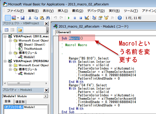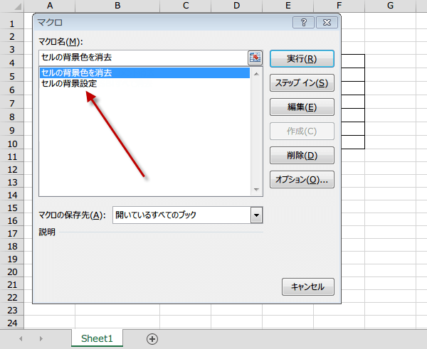 Macro1というデフォルトの名前から「セルの背景設定」という名前に変更しました。
