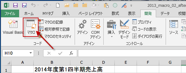 Excelに戻ったら、開発タブにある、コードグループのマクロボタンをクリックして