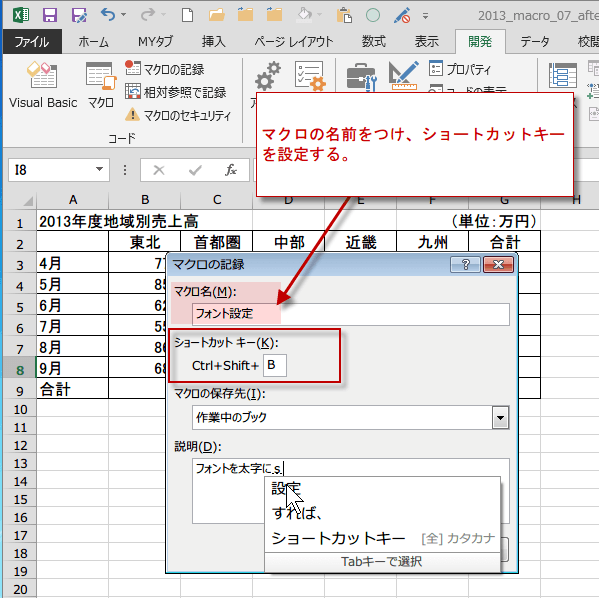 マクロの記録ダイアログボックスが開くので、名前をつけて、ショートカットキーも設定します。