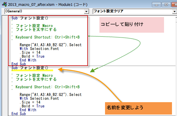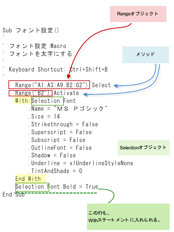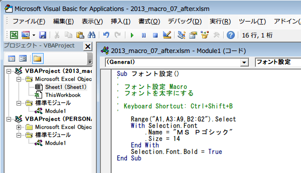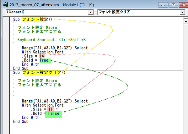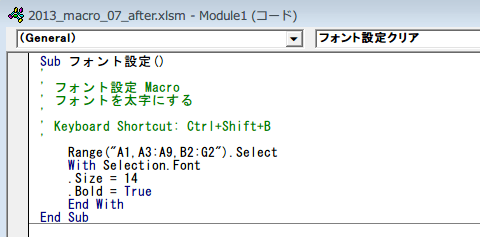 マクロ講座7回で作成したマクロの記録「フォント設定」を見てみましょう。
