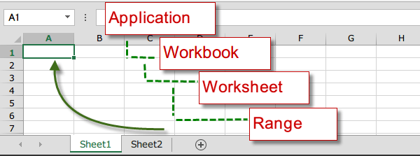 ただし、VBAで扱う場合のオブジェクトは、階層構造で考えないといけません。たとえば、セルA1を指定する時に、シートが複数あれば、どのシートかわかりません。さらに複数のブックを開いていたらどのブックかわかりませんね。