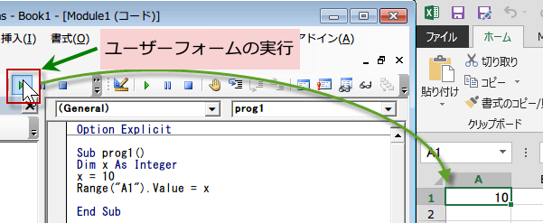 VBEを終了したくない場合は、2のユーザーフォームの実行ボタンから実行してみましょう。