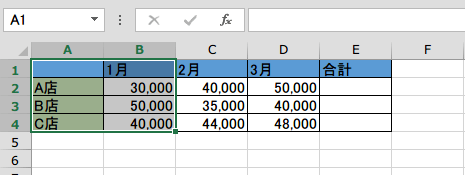 マクロの記録で、セルE2:E4を選択して、 =SUM(B2:D2)と入力し、 CTRLキーを押しながらEnterキーを押します。