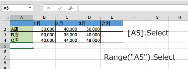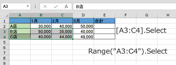 Range("E2:E4").Select は、合計欄E2:E4を選択するコードですが、次はちょっと見慣れない形式で書かれています。