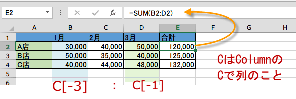 SUM(B2:D2)と入力したにもかかわらず、R1C1形式に変わっているのです。