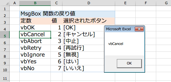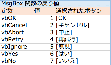 MsgBox関数には戻り値があり、「メッセージボックス上でユーザーが押したボタン」返します。