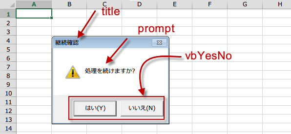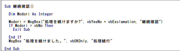 Modori = MsgBox("処理を続けますか?", vbYesNo + vbExclamation, "継続確認")