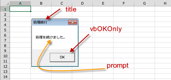 MsgBox "処理を続けました。", vbOKOnly, "処理続行"
