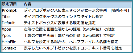 ダイアログボックスを表示してユーザーからの情報を文字列として入力してもらう便利な関数がInputBox関数です。