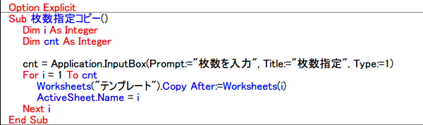 今回は、必要枚数を指定してシートをコピーするマクロを作成します。