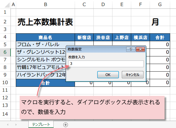 マクロを実行すると、ダイアログボックスが表示される