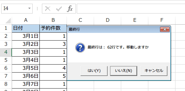 MsgBox "最終行は: " & LastRow & "行です。移動しますか", vbYesNoCancel