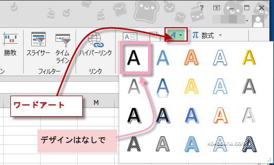 まず、リボンの「挿入」ボタンをクリックし、テキストグループの「ワードアート」をクリックします。