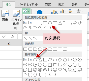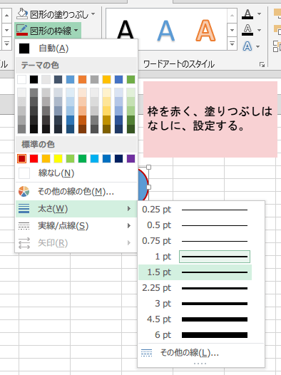 オートシェイプで赤丸を作成します。