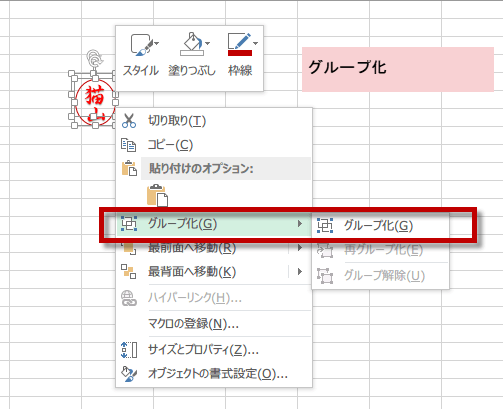 右メニューの「グループ化」から 「グループ化」をクリックします。