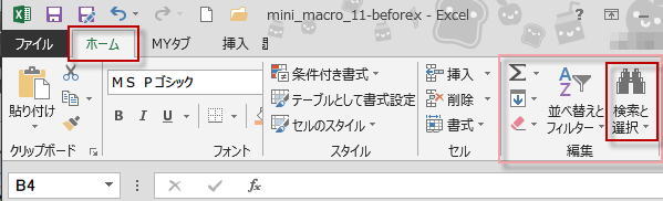 ホームタブの、編集グループにある、検索と選択ボタンをクリックして、