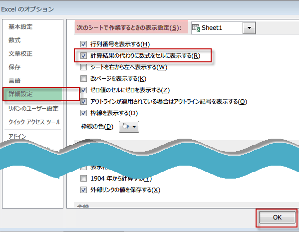 計算結果の代わりに数式をセルに表示するにチェックを入れます。
