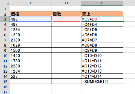 入力している式を確認するには、確認したいセルを選択し、数式バーに表示される式を参照します。