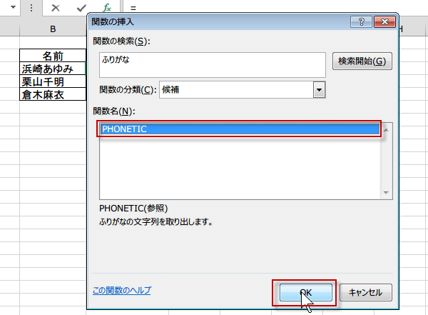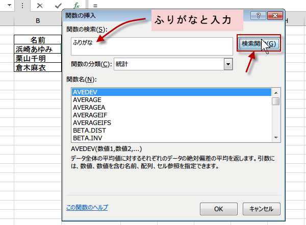 関数の挿入ダイアログボックスが表示されるので、関数の検索ボックスにふりがなと入力します。