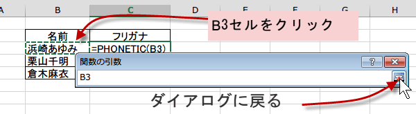 B3セルをクリックすると、自動的に引数の入力欄に表示されます。