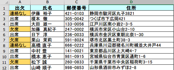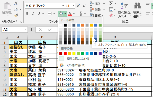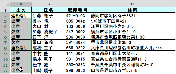 一番多いのは、出席ですので、出席以外のセルを選択してみましょう。