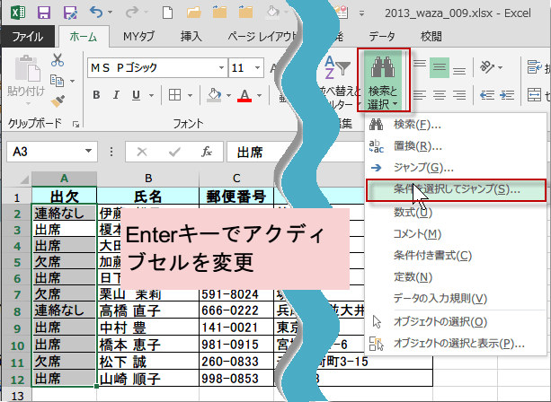 例では、A2:A12まで選択してますが、アクティブセルがA2ですので、Enterキーを押して、出席をアクディブにします。