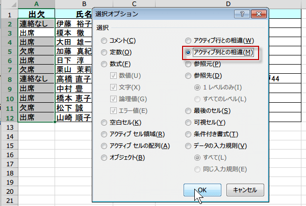 そして、選択オプションダイアログボックスで、アクティブ列との相違にチェックを入れます。