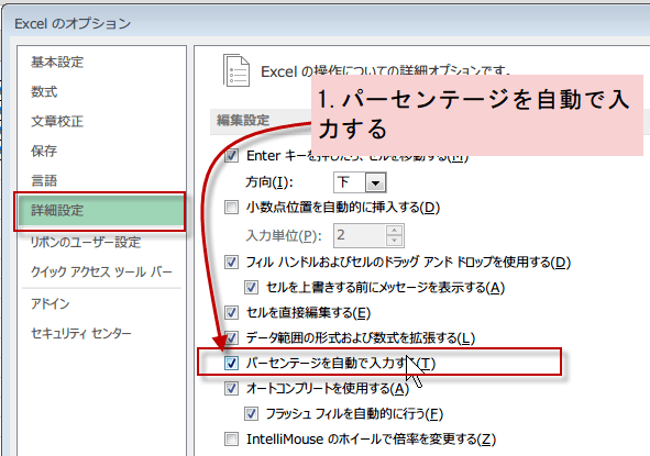 1.[Excelのオプション]にある、[詳細設定]の[編集設定]欄に