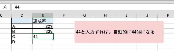 44と入力すれば、44%と自動的にパーセント表示されます。