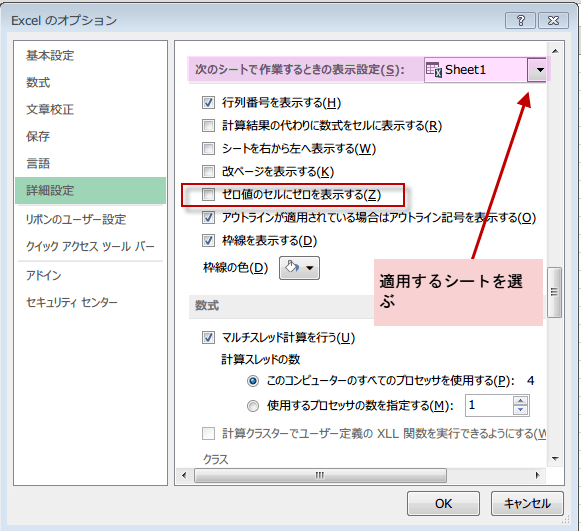 シート全体のゼロの表示と非表示を切り替えるには、