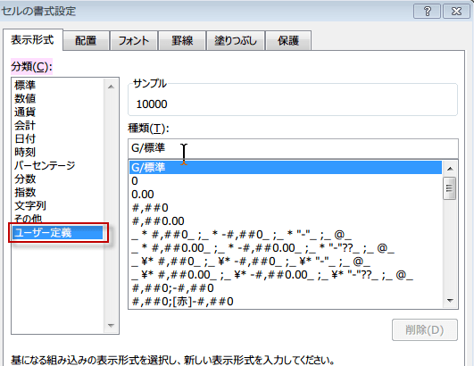 セルの書式設定ダイアログが表示されたら、「分類」 ボックスの「ユーザー定義」をクリックします。