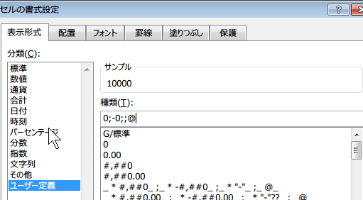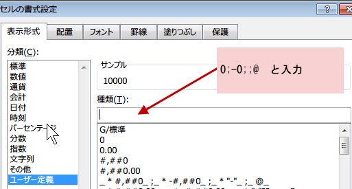 標準を選択していますが、それを消して、0;-0;;@と入力します。