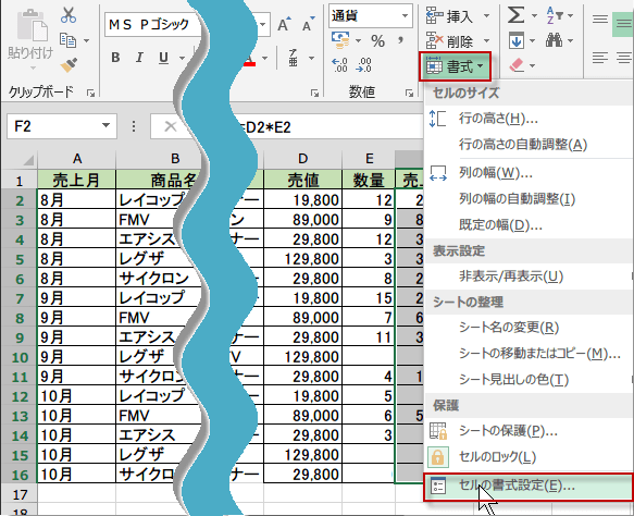 0を表示したくない範囲を選択して、セルの書式設定をクリックします。