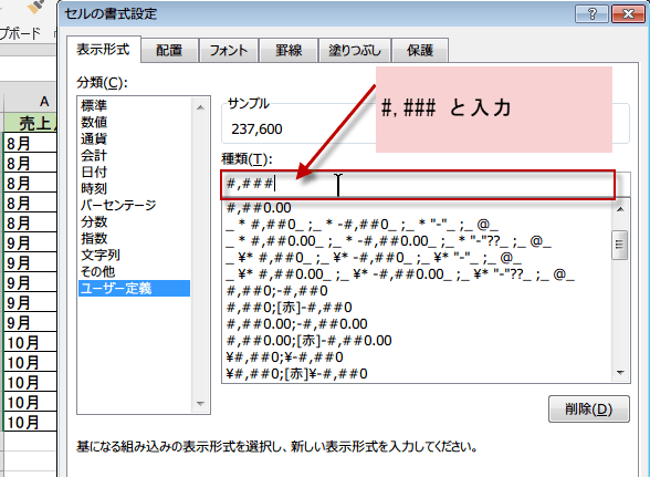 表示形式タブの分類項目から、ユーザー定義を選択して、