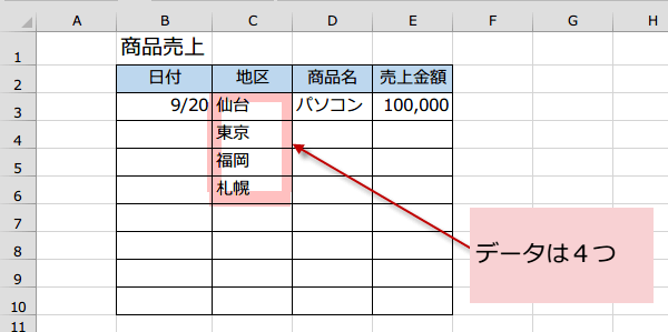 たとえば、商品の売上を地区ごととか、支店ごとに入力する場合、例では、地区の項目が4つだけです。