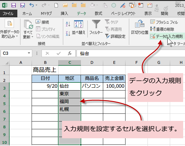 つづいて、データタブにある、データツールグループの入力規則をクリックします。(Excel2003の場合は、メニューの「データ」をクリックして、 入力規制をクリックします。)