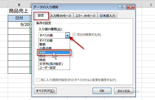 設定タブの条件の設定で、入力値の種類欄で「リスト」を選択します。