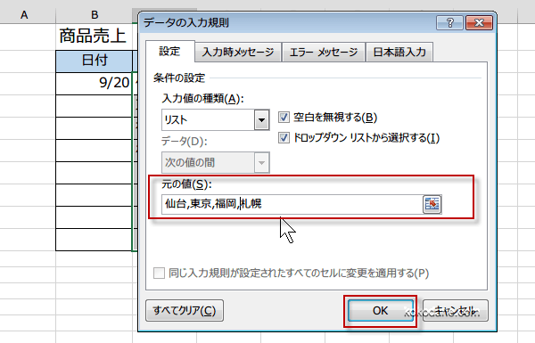 個々に入力する場合も、データーの間に「,」カンマ区切りを入れてください。入力したらOKをクリックします。
