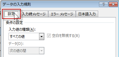 データの入力規制ダイアログが表示されたら、設定タブをクリックします。