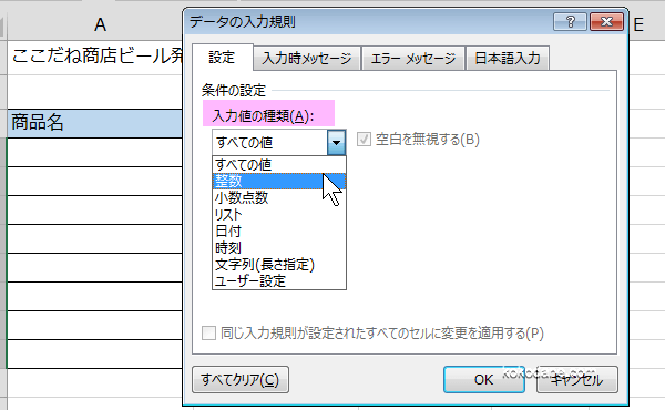 「入力値の種類」 ボックスの 「整数」をクリックします。