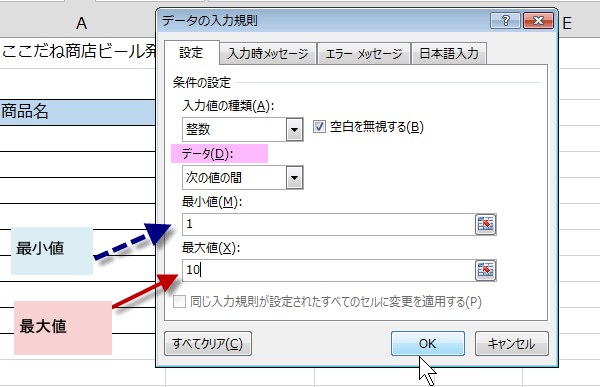Excel セルに入力できる数値データ範囲を制限する