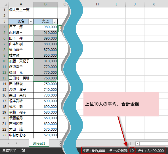 また、フィルタを使って降順に並べ替えれば、上位10人の合計は?とか