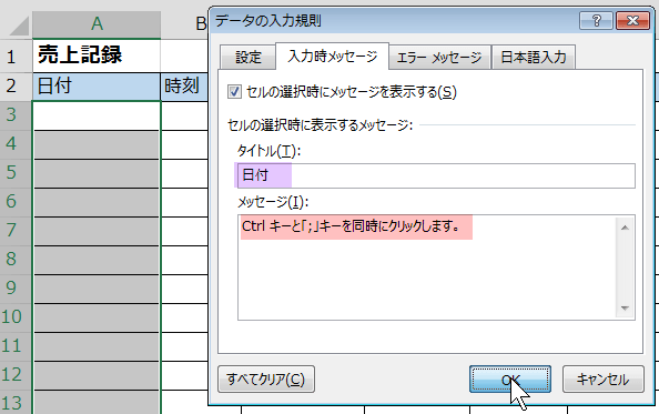 そして、タイトルに「日付」、メッセージには、「Ctrl キーと「;」キーを同時にクリックします。」と記入して、OKをクリック。
