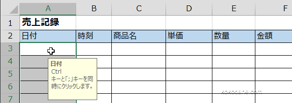 日付を入力するセルを選択すると、ヒントメッセージが表示されます。