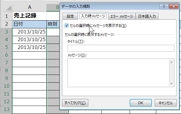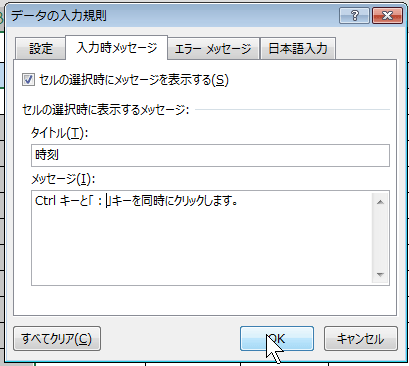 同様にして、時刻を入力するセルにも入力メッセージを設定しておきます。