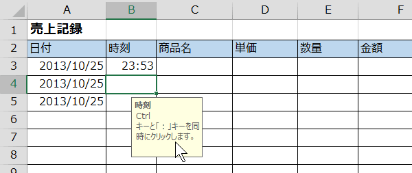 時刻を入力するセルを選択するとメッセージが表示されます。