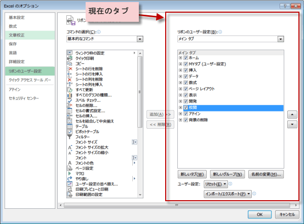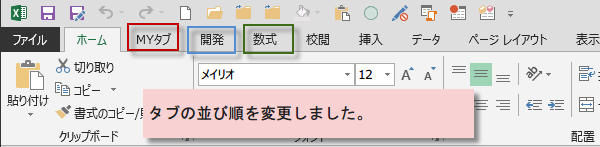 リボンのタブの並び順を変えるには、Excelのオプション設定のリボンのユーザー設定から行います。