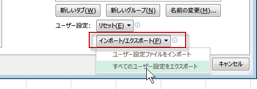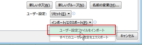 Excelのオプション設定のリボンのユーザー設定から、インポート/エクスポートボタンをクリックします。